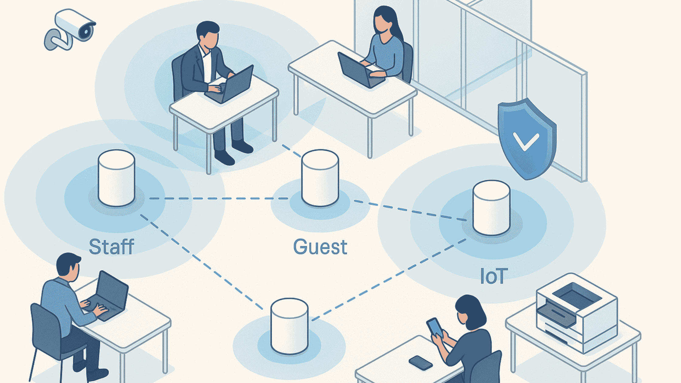 Most offices start with a single consumer router, then add extenders or a second router when coverage falters. That patchwork creates overlapping signals, competing SSIDs, and a support roulette of “try rebooting it.” Devices cling to weak signals; roaming breaks calls; guest phones end up on the same flat network as laptops and printers. You’re constantly firefighting.