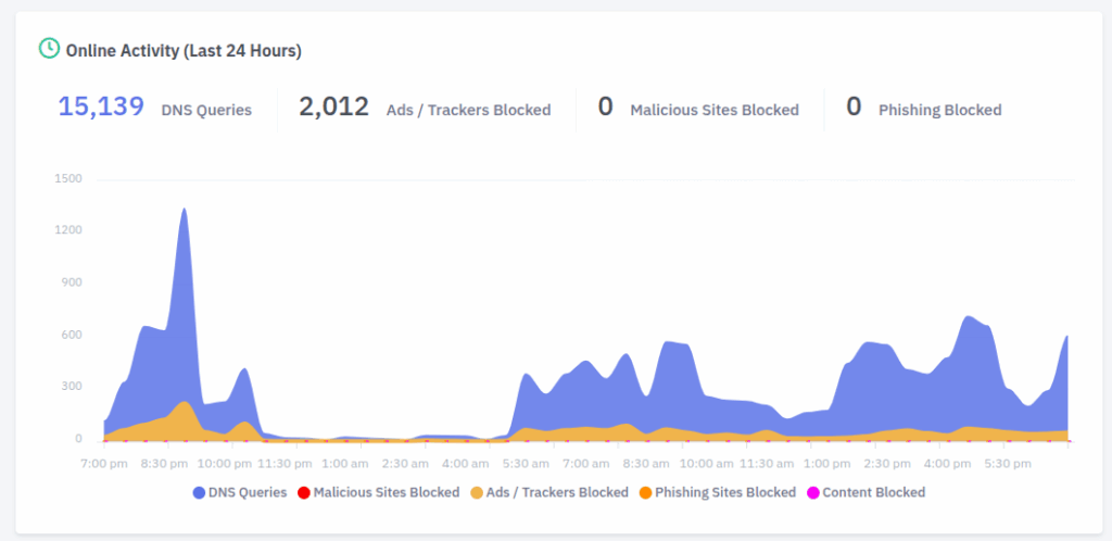 - Malware & phishing protection: Blocks known-bad and suspicious domains before connections complete—stopping fake logins and drive-by downloads at the source.