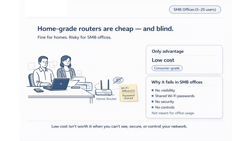 Bottom line: Home routers optimize for affordability, but SMBs need visibility + control + protection.