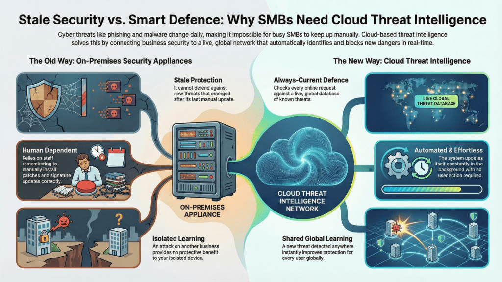 Without automatic updates from the cloud, an SMB’s defenses slowly fall behind. It’s like locking your doors but leaving the windows open because you never checked them again after moving in.